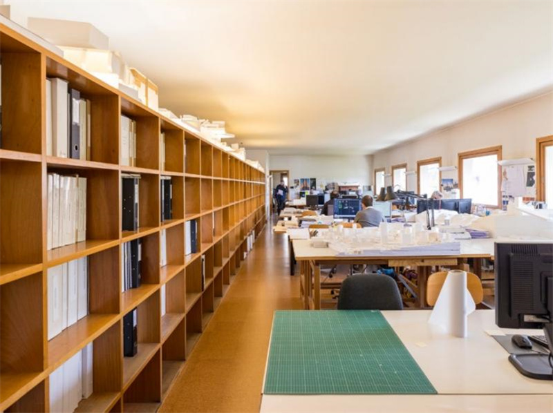 實木書柜貫穿了整個房間,辦公桌同樣采用實木材料與軟木地板天然紋理相融合,整個空間充斥著柔和的色調。軟木材料降噪且柔軟的特性,使得身處室內卻仍能讓人感受到自然的溫暖與厚重。